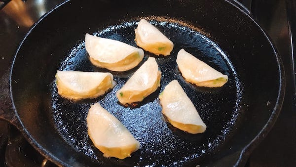 - In a well-heated non-stick or cast iron skillet, add 1tbsp oil. Pan fry the dumplings for about 2 minutes over medium heat. You might need to fry them in separate batch so as to not overcrowd the skillet. Please do not flip the dumplings.